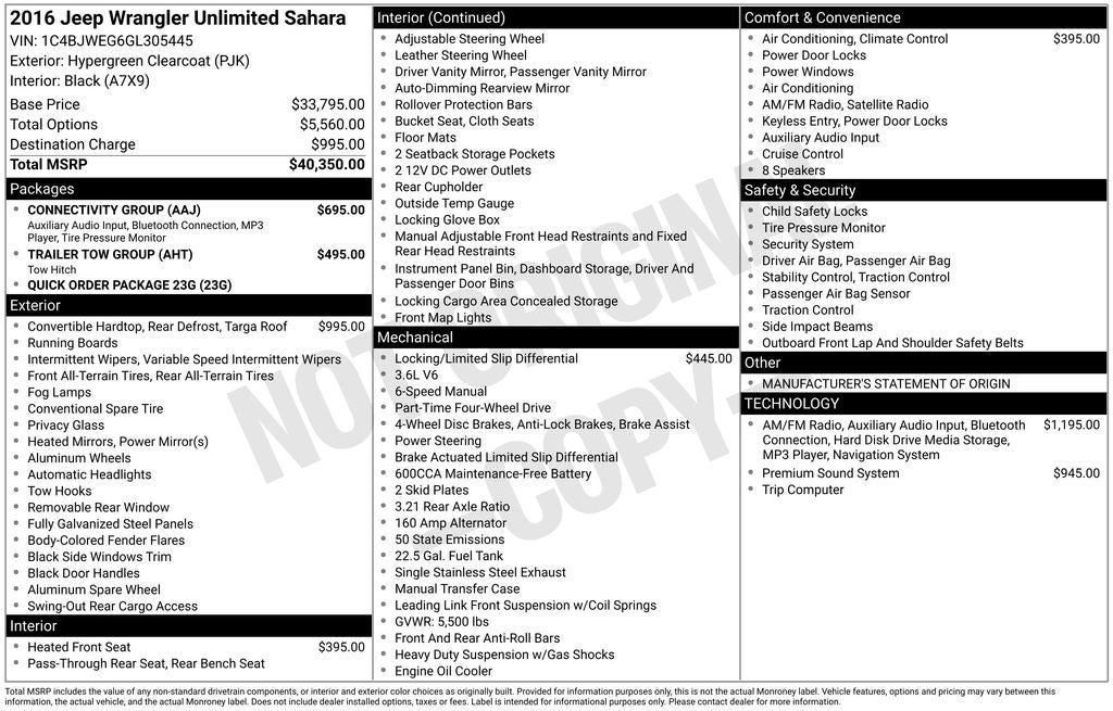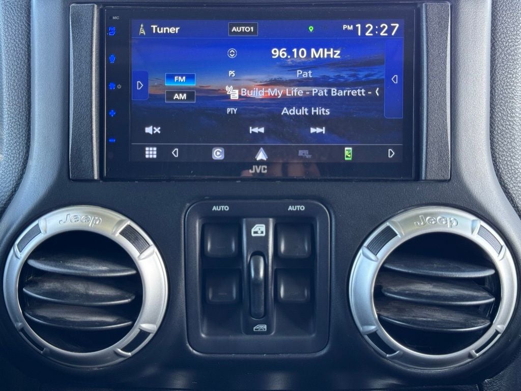 Certified Pre-Owned Go Certified, Body Color Appliques Front Bumper, Body Color Appliques Rear Bumper, Body Color/Accent Color Grille, Class II Receiver Hitch, Connectivity Group, GPS Navigation, Leather Wrapped Steering Wheel, Quick Order Package 23G, Remote USB Port, Tire Pressure Monitoring Display, Trailer Tow Group, Trailer Tow w/4-Pin Connector Wiring, Uconnect Voice Command w/Bluetooth®, Vehicle Information Center, 18 x 7.5 Polished Satin Carbon Wheels, 3.21 Rear Axle Ratio, 4-Wheel Disc Brakes, 40GB Hard Drive w/28GB Available, 5-Year SiriusXM Travel Link Service, 6.5 Touchscreen Display, 8 Speakers, ABS brakes, Air Conditioning, Air Conditioning w/Auto Temperature Control, Air Filtering, Alloy wheels, Alpine 9-Speaker w/All Weather Subwoofer, AM/FM radio: SiriusXM, Anti-Spin Differential Rear Axle, Audio Jack Input for Mobile Devices, Auto-dimming Rear-View mirror, Black 3-Piece Hard Top, Brake assist, CD player, Cloth Seats w/Adjustable Head Restraints, Compass, Driver door bin, Driver vanity mirror, Dual front impact airbags, Electronic Stability Control, Freedom Panel Storage Bag, Front anti-roll bar, Front Bucket Seats, Front Center Armrest w/Storage, Front fog lights, Front reading lights, Fully automatic headlights, Heated door mirrors, Heated Front Seats, Heavy Duty Suspension w/Gas Shocks, Humidity Sensor, Illuminated entry, Integrated roll-over protection, Leather steering wheel, Low tire pressure warning, Manufacturer's Statement of Origin, Occupant sensing airbag, Outside temperature display, Panic alarm, Passenger door bin, Passenger vanity mirror, Power door mirrors, Power steering, Power windows, Radio data system, Radio: 130, Radio: 430N, Rear anti-roll bar, Rear Window Defroster, Rear Window Wiper/Washer, Remote keyless entry, Security system, SiriusXM Travel Link, Speed control, Split folding rear seat, Steering wheel mounted audio controls, Sunrider Soft Top, Tachometer, Tilt steering wheel, Traction control, Trip computer, Variably intermittent wipers, Body Color Appliques Front Bumper, Body Color Appliques Rear Bumper, Body Color/Accent Color Grille, Class II Receiver Hitch, Connectivity Group, GPS Navigation, Leather Wrapped Steering Wheel, Quick Order Package 23G, Remote USB Port, Tire Pressure Monitoring Display, Trailer Tow Group, Trailer Tow w/4-Pin Connector Wiring, Uconnect Voice Command w/Bluetooth®, Vehicle Information Center.
