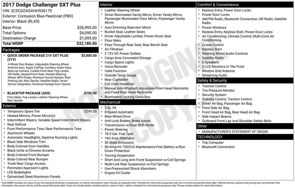 1-YR SiriusXM Guardian Trial, 1-Yr SiriusXM Radio Service, 276 Watt Amplifier, 3.07 Rear Axle Ratio, 8.4 Touchscreen Display, Anti-Lock 4-Wheel Disc Performance Brakes, Apple CarPlay, Black Fuel Filler Door, Black Grille w/Bezel, Black-Edged Premium Floormats, Blacktop Package, Blacktop Stripe, Bright Pedals, Challenger Blacktop Grille Badge, Door Trim Panel w/Ambient Lighting, Fog Lamps, For Details, Visit DriveUconnect.com, For More Info, Call 800-643-2112, Gloss Black I/P Cluster Trim Rings, Google Android Auto, GPS Antenna Input, HD Radio, Heated Front Seats, Heated Steering Wheel, Hectic Mesh Interior Accents, Integrated Center Stack Radio, Leather Performance Steering Wheel, Leather Trim Seats, Media Hub (2 USB, AUX), Nappa Leather Sport Seat, ParkSense Rear Park Assist System, ParkView Rear Back-Up Camera, Power Tilt/Telescope Steering Column, Quick Order Package 21V SXT Plus, Radio: Uconnect 4C w/8.4 Display, Rear Black Spoiler, Rear Bodycolor Spoiler, Rhombi 2-Pc Wheel Center Cap, Shark Fin Antenna, SiriusXM Satellite Radio, Universal Garage Door Opener, USB Host Flip, Ventilated Front Seats, Wheels: 20 x 8.0 Granite Crystal Aluminum, 4-Wheel Disc Brakes, 6 Speakers, ABS brakes, Air Conditioning, Alloy wheels, AM/FM radio, Anti-whiplash front head restraints, Auto-dimming Rear-View mirror, Automatic temperature control, Brake assist, Bumpers: body-color, Compass, Delay-off headlights, Driver door bin, Driver vanity mirror, Dual front impact airbags, Dual front side impact airbags, Electronic Stability Control, Four wheel independent suspension, Front anti-roll bar, Front Bucket Seats, Front Center Armrest, Front dual zone A/C, Front reading lights, Fully automatic headlights, Heated door mirrors, Houndstooth Cloth Sport Seats, Illuminated entry, Integrated Voice Command w/Bluetooth®, Leather Shift Knob, Low tire pressure warning, Outside temperature display, Overhead airbag, Overhead console, Panic alarm, Passenger door bin, Passenger vanity mirror, Power door mirrors, Power driver seat, Power steering, Power windows, Radio data system, Radio: Uconnect 3 w/5 Display, Rear anti-roll bar, Rear reading lights, Rear seat center armrest, Rear window defroster, Remote keyless entry, Security system, Speed control, Speed-sensing steering, Split folding rear seat, Steering wheel mounted audio controls, Tachometer, Telescoping steering wheel, Tilt steering wheel, Traction control, Trip computer, Variably intermittent wipers, Wheels: 18 x 7.5 Cast Aluminum, Wheels: 20 x 8.0 Gloss Black Painted Aluminum, 1-YR SiriusXM Guardian Trial, 1-Yr SiriusXM Radio Service, 276 Watt Amplifier, 3.07 Rear Axle Ratio, 8.4 Touchscreen Display, Anti-Lock 4-Wheel Disc Performance Brakes, Apple CarPlay, Black Fuel Filler Door, Black Grille w/Bezel, Black-Edged Premium Floormats, Blacktop Package, Blacktop Stripe, Bright Pedals, Challenger Blacktop Grille Badge, Door Trim Panel w/Ambient Lighting, Fog Lamps, For Details, Visit DriveUconnect.com, For More Info, Call 800-643-2112, Gloss Black I/P Cluster Trim Rings, Google Android Auto, GPS Antenna Input, HD Radio, Heated Front Seats, Heated Steering Wheel, Hectic Mesh Interior Accents, Integrated Center Stack Radio, Leather Performance Steering Wheel, Leather Trim Seats, Media Hub (2 USB, AUX), Nappa Leather Sport Seat, ParkSense Rear Park Assist System, ParkView Rear Back-Up Camera, Power Tilt/Telescope Steering Column, Quick Order Package 21V SXT Plus, Radio: Uconnect 4C w/8.4 Display, Rear Black Spoiler, Rear Bodycolor Spoiler, Rhombi 2-Pc Wheel Center Cap, Shark Fin Antenna, SiriusXM Satellite Radio, Universal Garage Door Opener, USB Host Flip, Ventilated Front Seats, Wheels: 20 x 8.0 Granite Crystal Aluminum.