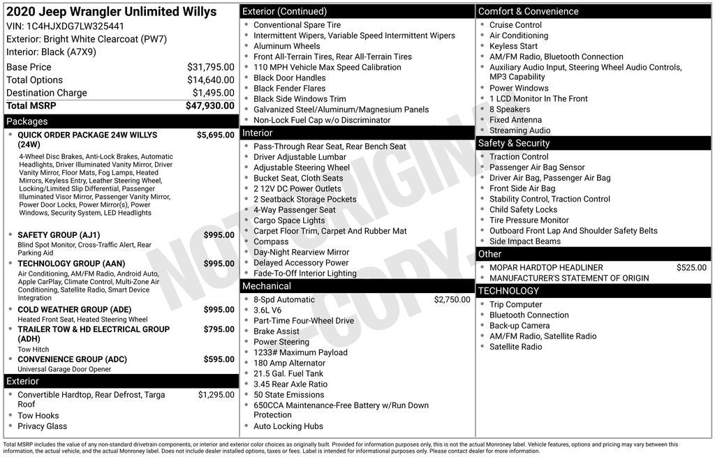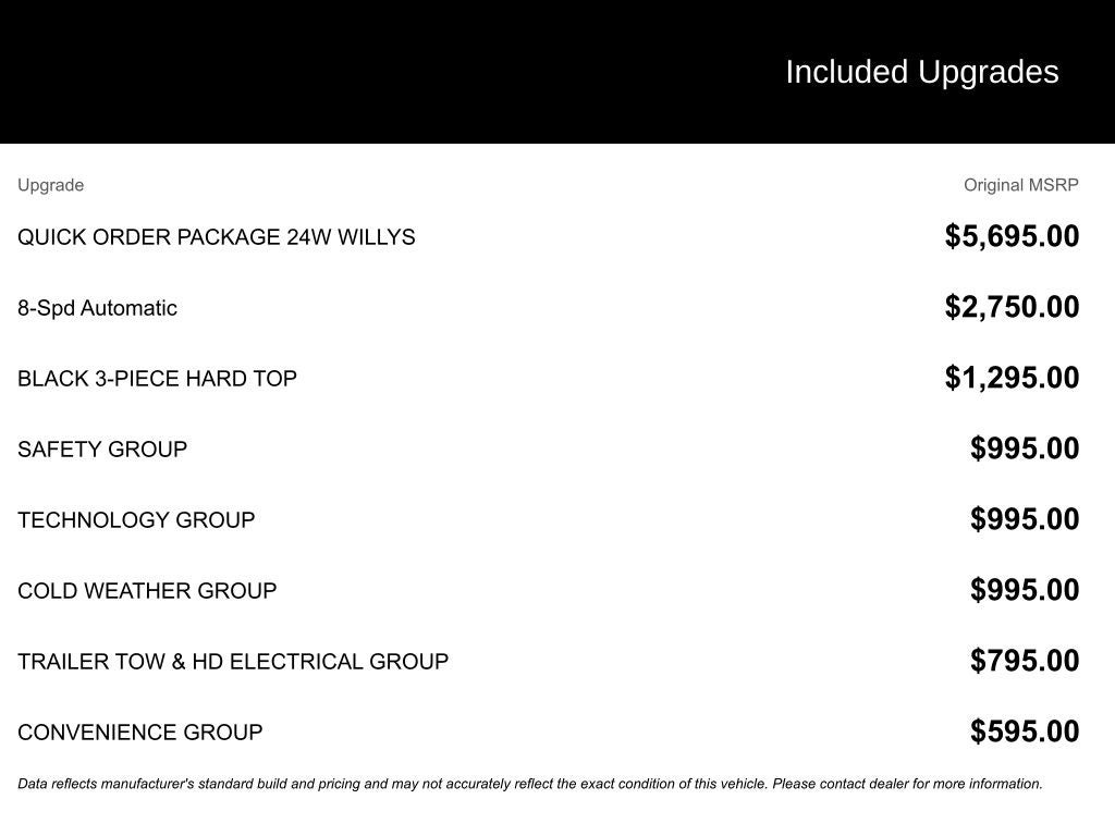 Certified Pre-Owned Go Certified, 1-Year SiriusXM Radio Service, 240 Amp Alternator, 4-Wheel Drive Swing Gate Decal, 7 & 4 Pin Wiring Harness, 7.0 Touchscreen Display, 700 Amp Maintenance Free Battery, Air Conditioning w/Auto Temperature Control, Air Filtering, Anti-Lock 4-Wheel Disc HD Brakes, Anti-Spin Differential Rear Axle, Apple CarPlay, Automatic Headlamps, Auxiliary Switches, Black 3-Piece Hard Top, Black Grille, Black Trail Rated Badge, Blind Spot & Cross Path Detection, Bridgestone Brand Tires, Class II Receiver Hitch, Cluster 7.0 TFT Color Display, Cold Weather Group, Convenience Group, Deep Tint Sunscreen Windows, Freedom Panel Storage Bag, Front 1-Touch Down Power Windows, Front LED Fog Lamps, Google Android Auto, GPS Antenna Input, Heated Front Seats, Heated Steering Wheel, Injection Molded Black Rear Bumper, Integrated Center Stack Radio, Leather Wrapped Steering Wheel, LED Headlamp & Fog Lamp Group, LED Reflector Headlamps, LED Taillamps, Matte Black Jeep Badge, MOPAR All-Weather Floor Mats, No Soft Top, ParkSense Rear Park Assist System, Power Heated Mirrors, Quick Order Package 24W Willys, Radio: Uconnect 4 w/7 Display, Rear Window Defroster, Rear Window Wiper/Washer, Remote Keyless Entry, Safety Group, Security Alarm, SiriusXM Satellite Radio, Speed Sensitive Power Locks, Sun Visors w/Illuminated Vanity Mirrors, Technology Group, Trailer Tow & HD Electrical Group, Universal Garage Door Opener, USB Host Flip, Wheels: 17 x 7.5 Moab Black Aluminum, Willys, Willys Hood Decal, Wrangler Decal, 3.45 Rear Axle Ratio, 4-Wheel Disc Brakes, 8 Speakers, ABS brakes, Air Conditioning, AM/FM radio, Apple CarPlay (DISC), Aux Battery, Brake assist, Cloth Low-Back Bucket Seats, Compass, Delay-off headlights, Driver door bin, Driver vanity mirror, Dual front impact airbags, Dual front side impact airbags, Electronic Stability Control, Front anti-roll bar, Front Bucket Seats, Front Center Armrest w/Storage, Front fog lights, Front reading lights, Google Android Auto (DISC), Integrated roll-over protection, Integrated Voice Command w/Bluetooth®, Low tire pressure warning, Manufacturer's Statement of Origin, MOPAR All-Weather Floor Mats (DISC), MOPAR Hardtop Headliner, Non-Lock Fuel Cap w/o Discriminator, Normal Duty Suspension, Occupant sensing airbag, Outside temperature display, ParkView Rear Back-Up Camera, Passenger door bin, Passenger vanity mirror, Power steering, Radio data system, Radio: Uconnect 3 w/5 Display, Rear anti-roll bar, Rear reading lights, Speed control, Split folding rear seat, Steering wheel mounted audio controls, Stop-Start Dual Battery System, Tachometer, Telescoping steering wheel, Tilt steering wheel, Traction control, Trip computer, Variably intermittent wipers, Wheels: 17 x 7.5 Black Steel Styled, 1-Year SiriusXM Radio Service, 240 Amp Alternator, 4-Wheel Drive Swing Gate Decal, 7 & 4 Pin Wiring Harness, 7.0 Touchscreen Display, 700 Amp Maintenance Free Battery, Air Conditioning w/Auto Temperature Control, Air Filtering, Anti-Lock 4-Wheel Disc HD Brakes, Anti-Spin Differential Rear Axle, Apple CarPlay, Automatic Headlamps, Auxiliary Switches, Black 3-Piece Hard Top, Black Grille, Black Trail Rated Badge, Blind Spot & Cross Path Detection, Bridgestone Brand Tires, Class II Receiver Hitch, Cluster 7.0 TFT Color Display, Cold Weather Group, Convenience Group,