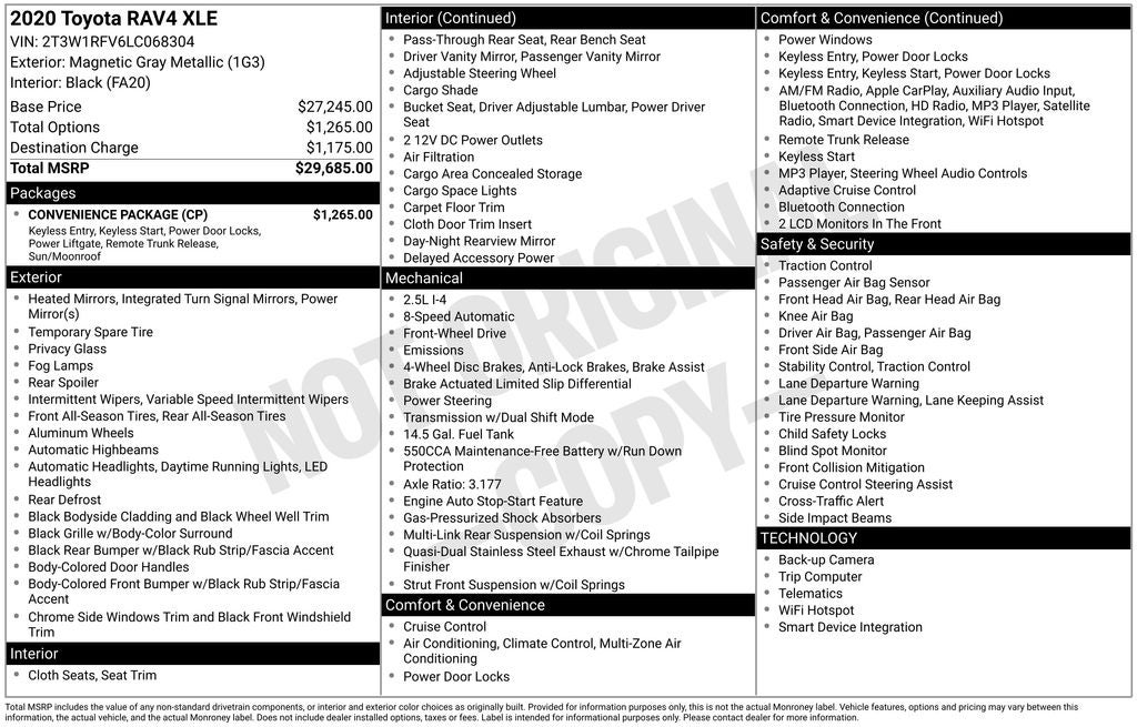 Black Cloth, Convenience Package, Front Door Smart Key System w/Push Button Start, Front dual zone A/C, Power driver seat, Remote keyless entry, Tilt & Slide Moon Roof, 4-Wheel Disc Brakes, 6 Speakers, ABS brakes, Air Conditioning, Alloy wheels, AM/FM radio: SiriusXM, AM/FM Stereo, Apple CarPlay/Android Auto, Auto High-beam Headlights, Automatic temperature control, Axle Ratio: 3.177, Brake assist, Bumpers: body-color, Delay-off headlights, Driver door bin, Driver vanity mirror, Dual front impact airbags, Dual front side impact airbags, Electronic Stability Control, Emergency communication system: Entune Safety Connect, Exterior Parking Camera Rear, Fabric Seat Trim, Four wheel independent suspension, Front anti-roll bar, Front Bucket Seats, Front Center Armrest, Front fog lights, Front reading lights, Fully automatic headlights, Heated door mirrors, Illuminated entry, Knee airbag, Low tire pressure warning, Occupant sensing airbag, Outside temperature display, Overhead airbag, Overhead console, Panic alarm, Passenger door bin, Passenger vanity mirror, Power door mirrors, Power steering, Power windows, Radio data system, Rear anti-roll bar, Rear seat center armrest, Rear window defroster, Rear window wiper, Roof rack: rails only, Speed control, Speed-sensing steering, Split folding rear seat, Spoiler, Steering wheel mounted audio controls, Tachometer, Telescoping steering wheel, Tilt steering wheel, Traction control, Trip computer, Turn signal indicator mirrors, Variably intermittent wipers, Wheels: 17 5-Spoke Silver Alloy, Black Cloth, Convenience Package, Front Door Smart Key System w/Push Button Start, Front dual zone A/C, Power driver seat, Remote keyless entry, Tilt & Slide Moon Roof.