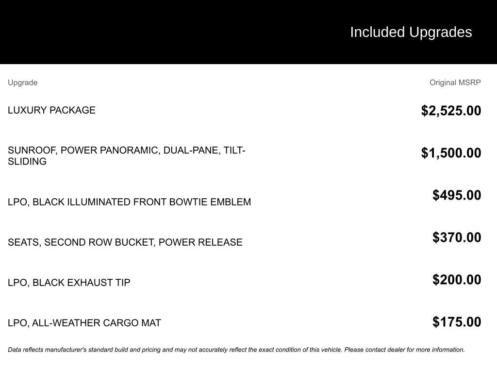 4WD, Black Leather, 1st & 2nd Row Color-Keyed Carpeted Floor Mats, 2-Speed Active Electronic AutoTrac Transfer Case, 2nd Row Pwr Release 60/40 Split-Folding Bench Seat, 3rd Row 60/40 Power-Folding Split-Bench Seat, Auto-Dimming Inside Rear-View Mirror, Automatic Stop/Start, Black Tubular Assist Steps, Bose 9-Speaker Stereo Audio System Feature, Bright Front & Rear Door Sill Plates, Color-Keyed Carpeting Floor Covering, Driver & Front Outboard Passenger Airbags, Driver Alert Package, Dual-Pane Power Panoramic Sunroof, Enhanced Driver Information Center, Floor Console w/Storage Area, Front High-Approach Angle Fascia, Hands-Free Rear Power Programmable Liftgate, HD Surround Vision, Heated 2nd Row Outboard Seats, Heated Steering Wheel, Hill Descent Control, Infotainment Display, Lane Change Alert w/Side Blind Zone Alert, Leather-Wrapped Steering Wheel, LED Daytime Running Lamps, License Plate Front Mounting Package, Luxury Package, Memory Settings, Memory Settings for Driver, Navigation System, Outside Heated Power-Adjustable Mirrors, Power Liftgate, Power Tilt & Telescopic Steering Column, Preferred Equipment Group 2Z7, Rear Cross Traffic Alert, Rear Pedestrian Alert, Red Horizontal-Mounted Recovery Hooks, Remote Start, SiriusXM Radio w/360L, Start/Stop System Disable Button, Universal Home Remote, Wireless Charging, 10-Way Power Driver & Passenger Seat Adjusters, 3.23 Rear Axle Ratio, 3rd row seats: split-bench, 4-Wheel Disc Brakes, 9 Speakers, ABS brakes, Air Conditioning, All-Weather Cargo Mat (LPO), Alloy wheels, AM/FM radio: SiriusXM with 360L, Apple CarPlay/Android Auto, Auto High-beam Headlights, Auto-dimming Rear-View mirror, Automatic temperature control, Black Exhaust Tip (LPO), Black Illuminated Front Bowtie Emblem (LPO), Brake assist, Bumpers: body-color, Compass, Delay-off headlights, Driver door bin, Driver vanity mirror, Dual front impact airbags, Dual front side impact airbags, Electronic Stability Control, Emergency communication system: OnStar and Chevrolet connected services capable, Four wheel independent suspension, Front anti-roll bar, Front Bucket Seats, Front Center Armrest, Front dual zone A/C, Front High-Back Reclining Bucket Seats, Front reading lights, Fully automatic headlights, Garage door transmitter, Heated door mirrors, Heated Driver & Front Passenger Seats, Heated front seats, Illuminated entry, Leather steering wheel, Leather-Appointed Seat Trim, Low tire pressure warning, Memory seat, Not Equipped w/Steering Column Lock, Occupant sensing airbag, Outside temperature display, Overhead airbag, Overhead console, Panic alarm, Passenger door bin, Passenger vanity mirror, Power door mirrors, Power driver seat, Power passenger seat, Power Release 2nd Row Bucket Seats, Power steering, Power windows, Premium audio system: Chevrolet Infotainment System 3, Premium Smooth Ride Suspension, Radio: Chevrolet Infotainment 3 Premium System, Rain sensing wipers, Rear air conditioning, Rear anti-roll bar, Rear reading lights, Rear seat center armrest, Rear window defroster, Rear window wiper, Remote keyless entry, Roof rack: rails only, Security system, Speed control, Speed-sensing steering, Split folding rear seat, Spoiler, Steering wheel mounted audio controls, Tachometer, Telescoping steering wheel, Tilt steering wheel, Traction control, Trip computer, Variably intermittent wipers, Voltmeter, Wheels: 20 x 9 Machined Aluminum, 4WD, Black Leather, 1st & 2nd Row Color-Keyed Carpeted Floor Mats, 2-Speed Active Electronic AutoTrac Transfer Case, 2nd Row Pwr Release 60/40 Split-Folding Bench Seat, 3rd Row 60/40 Power-Folding Split-Bench Seat, Auto-Dimming Inside Rear-View Mirror, Automatic Stop/Start, Black Tubular Assist Steps, Bose 9-Speaker Stereo Audio System Feature, Bright Front & Rear Door Sill Plates, Color-Keyed Carpeting Floor Covering, Driver & Front Outboard Passenger Airbags,