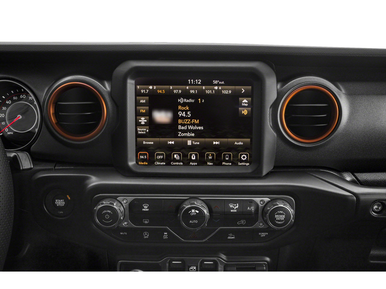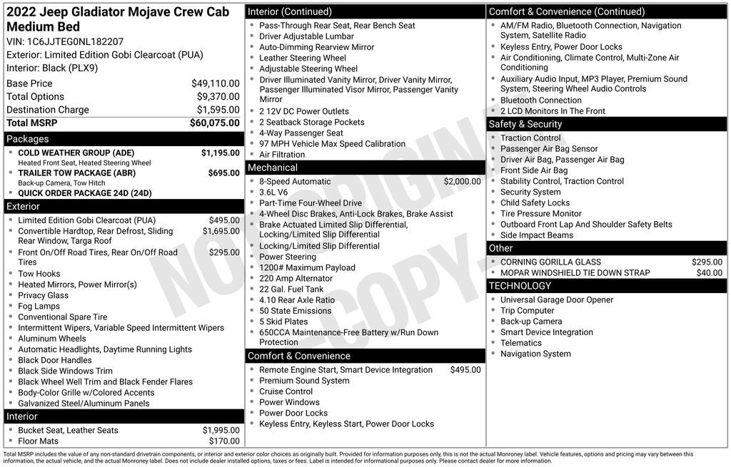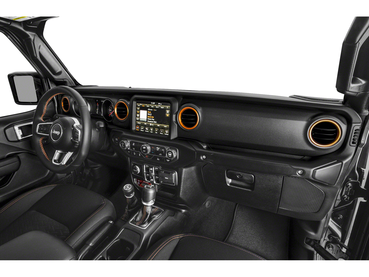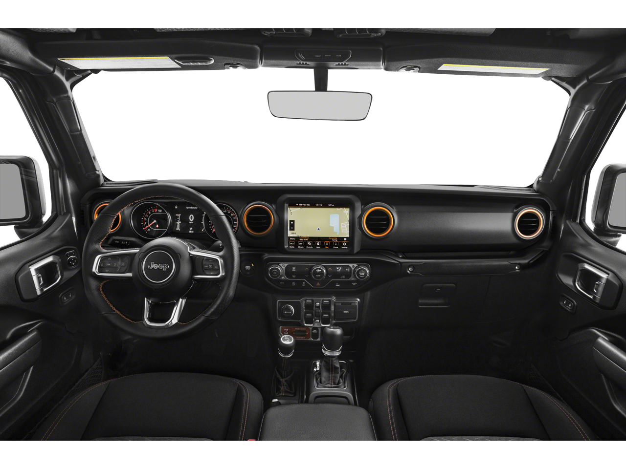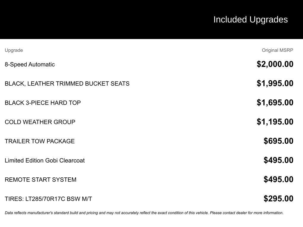 240 Amp Alternator, 4-Wheel Disc Brakes, 4.10 Rear Axle Ratio, 9 Speakers, 97 MPH Vehicle Max Speed Calibration, ABS brakes, Air Conditioning, Alloy wheels, AM/FM radio: SiriusXM, Apple CarPlay/Android Auto, Auto-dimming Rear-View mirror, Automatic temperature control, Black 3-Piece Hard Top, Brake assist, Class IV Receiver Hitch, Cold Weather Group, Compass, Corning Gorilla Glass, Delay-off headlights, Driver door bin, Driver vanity mirror, Dual front impact airbags, Dual front side impact airbags, Electronic Stability Control, Emergency communication system: SiriusXM Guardian, Freedom Panel Storage Bag, Front anti-roll bar, Front Bucket Seats, Front Center Armrest w/Storage, Front dual zone A/C, Front fog lights, Front reading lights, Fully automatic headlights, Garage door transmitter, Heated door mirrors, Heated Front Seats, Heated Steering Wheel, Heavy Duty Suspension w/Gas Shocks, Heavy-Duty Engine Cooling, Illuminated entry, Integrated roll-over protection, Leather steering wheel, Low tire pressure warning, MOPAR All-Weather Slush Mats, MOPAR Windshield Tie Down Strap, Navigation System, Occupant sensing airbag, Outside temperature display, Panic alarm, ParkView Rear Back-Up Camera, Passenger door bin, Passenger vanity mirror, Power door mirrors, Power steering, Power windows, Premium Cloth Seats w/Sport Bolsters, Quick Order Package 24D, Radio data system, Radio: Uconnect 4C Nav w/8.4 Display, Rear anti-roll bar, Rear reading lights, Rear Sliding Window, Rear Window Defroster, Remote keyless entry, Remote Start System, Security system, Speed control, Split folding rear seat, Steering wheel mounted audio controls, Tachometer, Telescoping steering wheel, Tilt steering wheel, Traction control, Trailer Hitch Zoom, Trailer Tow Package, Trip computer, Variably intermittent wipers, Voltmeter, Wheels: 17 x 7.5 Low Gloss Black Aluminum.