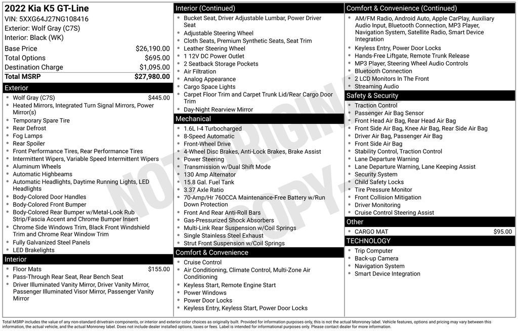 Recent Arrival! 2022 Kia K5 GT-Line GT-Line 27/37 City/Highway MPG Odometer is 36501 miles below market average!