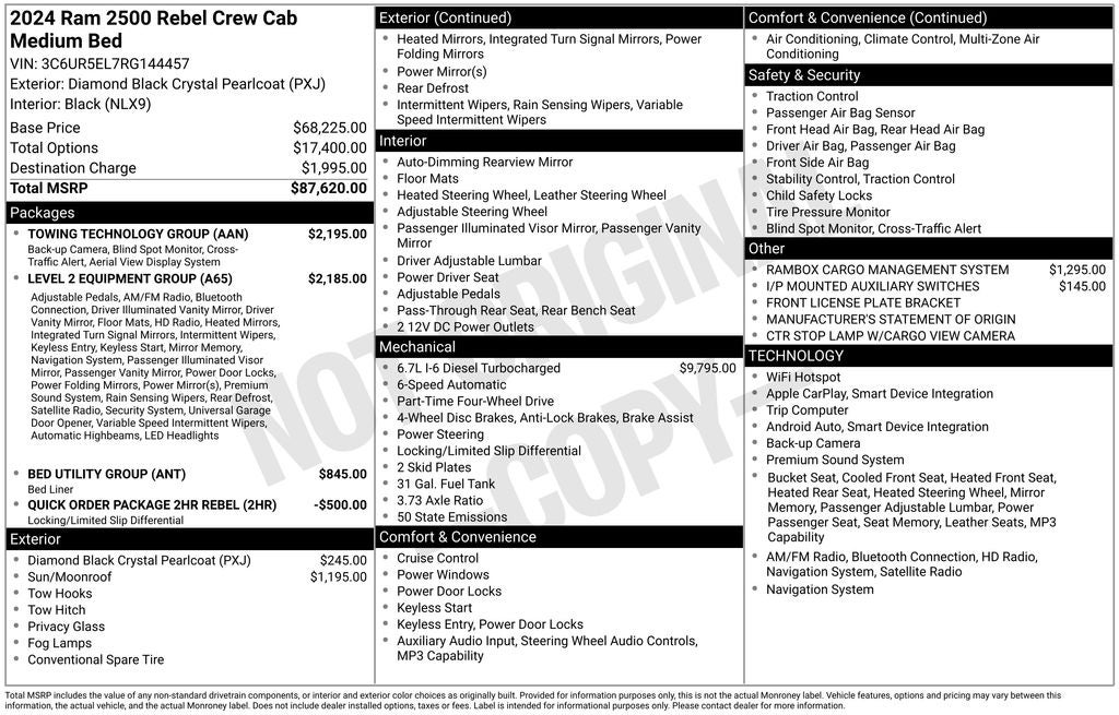 Certified Pre-Owned Gold Certified, 12 Touchscreen Display, 17 Speaker harman/kardon Premium Sound, 220 Amp Alternator, 2nd Row In Floor Storage Bins, 4G LTE Wi-Fi Hot Spot, 4x4 Badge, Alexa Built-In, Aluminum Litho Instrument Panel Bezels w/Blk Trim, Apple CarPlay, Auto Adjust In Reverse Exterior Mirrors, Auto Dim Exterior Mirror, Auto High Beam Headlamp Control, Auto Power-Folding Mirrors, Auto-Dimming Exterior Passenger Mirror, Bed Utility Group, Bi-Function LED Projector Headlamps, Black Exterior Mirrors, Black Rotary Shifter w/Silver Stripe, Blind Spot & Cross Path Detection, Body Color Door Handles, Connected Travel & Traffic Services, Connectivity - US/Canada, Conventional Differential Front Axle, CTR Stop Lamp w/Cargo View Camera, Disassociated Touchscreen Display, Electric Shift-On-The-Fly Transfer Case, Exterior Mirrors Courtesy Lamps, Exterior Mirrors w/Heating Element, Exterior Mirrors w/Memory, Exterior Mirrors w/Supplemental Signals, For Details, Visit DriveUconnect.com, For More Info, Call 800-643-2112, Forward & Reverse Utility Lights, Front Door Accent Lighting, Global Telematics Box Module (TBM), Google Android Auto, GPS Antenna Input, GPS Navigation, HD Radio, Instrument Cluster Theme 2 - Rebel, Integrated Voice Command w/Bluetooth®, Leather Wrapped Grab Handle, LED Bed Lighting, LED Dome Lamp w/On/Off Switch, LED Interior Lighting, Level 2 Equipment Group, Limited Slip Rear Differential w/Electronic Lock, Luxury Door Trim Panel (CTH), Mirror Running Lights, MOPAR Deployable Bed Step, MOPAR Front & Rear Rubber Floor Mats, MOPAR Spray In Bedliner, Navigation System, Off-Road Information Pages, Overhead LED Lamps, Painted Semi-Texture Film Instrument Panel Bezels, Power Adjust Mirrors, Power Adjustable Convex Aux Mirrors, Power Adjustable Pedals w/Memory, Power Heated Fold Telescopic Mirrors w/Memory, Power Telescoping Mirrors, Premium Overhead Console, Quick Order Package 2HR Rebel, Radio: Uconnect 5 Nav w/12.0 Display, Rain Sensitive Windshield Wipers, Rear Door Accent Lighting, Rear Power Sliding Window, Rear Window Defroster, Rebel Badge, Rebel Instrument Panel Badge, Rebel Suspension, Remote Proximity Keyless Entry, Security Alarm, Selectable Tire Fill Alert, SiriusXM Radio Service, SiriusXM w/360L, Sport Performance Hood, Sun Visors w/Illuminated Vanity Mirrors, Surround View Camera System, Towing Technology Group, Trailer Reverse Guidance, Trailer Tow Pages, Universal Garage Door Opener, Wheels: 20 x 8.0 Black Diamond Cut Aluminum, 2 Way Rear Headrest Seat, 3.73 Axle Ratio, 4 Adjustable Cargo Tie-Down Hooks, 4 Way Front Headrests, 4-Wheel Disc Brakes, 40/20/40 Split Bench Seat, 6 Speakers, ABS brakes, Active Noise Control System, Adjustable pedals, Air Conditioning, Alloy wheels, AM/FM radio: SiriusXM with 360L, Apple CarPlay/Android Auto, Auto-dimming Rear-View mirror, Automatic temperature control, Black Wheel Center Hub, Block heater, Brake assist, Cloth Heated Power Bench Seat (DISC), Compass, Dash Pass Thru Wire Circuits, Delay-off headlights, Driver door bin, Dual front impact airbags, Dual front side impact airbags, Electronic Stability Control, Electronically Controlled Throttle, Folding Flat Load Floor Storage, Front anti-roll bar, Front Center Armrest w/Storage, Front dual zone A/C, Front fog lights, Front License Plate Bracket, Front reading lights, Fully automatic headlights, Heated door mirrors, Heated front seats, Heated steering wheel, I/P Mounted Auxiliary Switches, Illuminated entry, Leather steering wheel, Low tire pressure warning, Manufacturer's Statement of Origin, Occupant sensing airbag, Outside temperature display, Overhead airbag, Overhead console, Panic alarm, ParkView Rear Back-Up Camera, Passenger door bin, Passenger vanity mirror, Power 2-Way Driver Lumbar Adjust, Power Adjust 8-Way Driver Seat, Power door mirrors, Power driver seat, Power steering,
