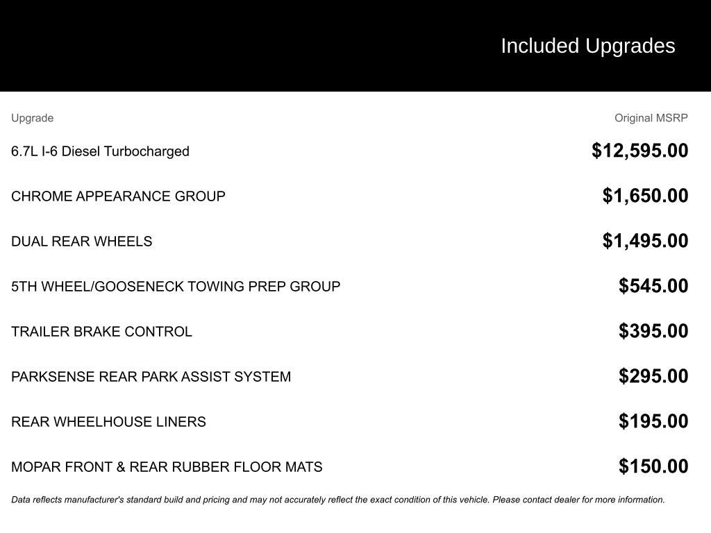 Certified Pre-Owned Gold Certified, Bright Front Bumper, Bright Rear Bumper, Bright Wheel Skins, Center Hub, Chrome Appearance Group, Chrome Grille Surround, Chrome Headlamp Bezels, Cold Weather Group, Engine Block Heater, Matte Black Mesh w/Chrome Grille, MOPAR Winter Front Grille Cover, Protection Group, Quick Order Package 21A Tradesman, Tradesman Level 1 Equipment Group, 2 Way Rear Headrest Seat, 3.73 Axle Ratio, 4 Way Front Headrests, 4-Wheel Disc Brakes, 40/20/40 Split Bench Seat, 5th Wheel/Gooseneck Towing Prep Group, 6 Speakers, 6000# Front Axle w/Hub Ext, ABS brakes, Active Noise Control System, Air Conditioning, AM/FM radio, Black Exterior Mirrors, Box & Rear Fender Clearance Lamps, Brake assist, Clearance Lamps, Compass, Delay-off headlights, Driver door bin, Dual front impact airbags, Dual front side impact airbags, Dual Rear Wheels, Electronic Stability Control, Electronically Controlled Throttle, Emergency communication system: SiriusXM Guardian, For Details Visit DriveUconnect.com, Front anti-roll bar, Front Armrest w/Cupholders, Front Center Armrest w/Storage, Front License Plate Bracket, Front reading lights, Fully automatic headlights, Global Telematics Box Module (TBM), GPS Antenna Input, HD Vinyl 40/20/40 Split Bench Seat, Illuminated entry, Integrated Voice Command w/Bluetooth®, Low tire pressure warning, Manual Adjust 4-Way Driver Seat, Manual Adjust 4-Way Front Passenger Seat, Manual Folding Exterior Mirrors, Manual Telescoping Mirrors, Manufacturer's Statement of Origin, MOPAR Front & Rear Rubber Floor Mats, Occupant sensing airbag, Outside temperature display, Overhead airbag, Overhead console, Panic alarm, ParkSense Rear Park Assist System, ParkView Rear Back-Up Camera, Passenger door bin, Passenger vanity mirror, Power steering, Power windows, Radio data system, Radio: Uconnect 3 w/5 Display, Rear Folding Seat, Rear step bumper, Rear Wheelhouse Liners, Remote keyless entry, Remote USB Port - Charge Only, Speed control, Storage Tray, Tachometer, Tilt steering wheel, Tip Start, Traction control, Trailer Brake Control, Trailer Light Check, Variably intermittent wipers, Voltmeter, Wheels: 17 x 6.0 Steel Argent, Wheels: 17 x 6.0 Steel Chrome Clad, Wheels: 18 x 8.0 Steel, Bright Front Bumper, Bright Rear Bumper, Bright Wheel Skins, Center Hub, Chrome Appearance Group, Chrome Grille Surround, Chrome Headlamp Bezels, Cold Weather Group, Engine Block Heater, Matte Black Mesh w/Chrome Grille, MOPAR Winter Front Grille Cover, Protection Group, Quick Order Package 21A Tradesman, Tradesman Level 1 Equipment Group.