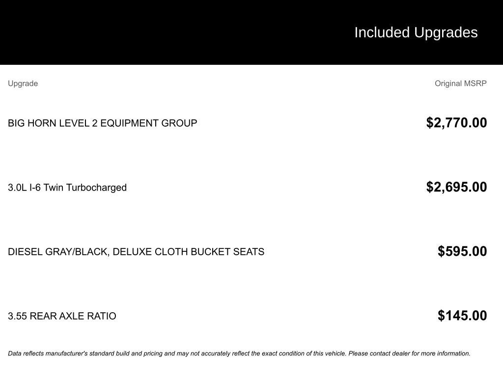Certified Pre-Owned Gold Certified, 115V Auxiliary Power Outlet, 115V Auxiliary Rear Power Outlet, 12 Touchscreen Display, 2nd Row In Floor Storage Bins, 400W Inverter, 4G LTE Wi-Fi Hot Spot, 9 Amplified Speakers w/Subwoofer, Air Conditioning ATC w/Dual Zone Control, Apple CarPlay, Auto Power-Folding Mirrors, Auto-Dimming Exterior Driver Mirror, Auto-Dimming Rear-View Mirror, Big Horn Level 2 Equipment Group, Black Exterior Mirrors, Black Premium Power Mirrors, Cluster 7.0 TFT Color Display, Configurable Drive Mode, Connected Travel & Traffic Services, Connectivity - US/Canada, Convex Wide-Angle Exterior Mirror Insert, Exterior Mirrors Courtesy Lamps, Exterior Mirrors w/Heating Element, Exterior Mirrors w/Supplemental Signals, Glove Box Lamp, Google Android Auto, GPS Antenna Input, GPS Navigation, HD Radio, Heated Front Seats, Heated Steering Wheel, Integrated Voice Command w/Bluetooth®, Leather Wrapped Steering Wheel, LED Dome Lamp w/On/Off Switch, LED Footwell Lighting, Media Hub w/2 Charge Only USBs, Overhead LED Lamps, Power 2-Way Driver Lumbar Adjust, Power Adjust 8-Way Driver Seat, Power Adjustable Pedals, Premium Overhead Console, Quick Order Package 21Z Big Horn, Radio: Uconnect 5 Nav w/12.0 Display, Rear Power Sliding Window, Rear Window Defroster, Remote Tailgate Release, Security Alarm, SiriusXM w/360L, Steering Wheel Mounted Audio Controls, Sun Visors w/Illuminated Vanity Mirrors, Universal Garage Door Opener, USB Host Flip, 3 Rear Seat Head Restraints, 4 Way Front Headrests, 4-Wheel Disc Brakes, 6 Speakers, ABS brakes, Air Conditioning, Alloy wheels, AM/FM radio, Apple CarPlay/Android Auto, Auto High-beam Headlights, Brake assist, Bumpers: chrome, Cloth Bench Seat, Compass, Delay-off headlights, Driver door bin, Dual front impact airbags, Dual front side impact airbags, Electronic Stability Control, Front anti-roll bar, Front Center Armrest w/Storage, Front fog lights, Front License Plate Bracket, Front reading lights, Front Seat Back Map Pockets, Front wheel independent suspension, Fully automatic headlights, Heated door mirrors, Illuminated entry, Low tire pressure warning, Manual Adjust 4-Way Front Passenger Seat, Manual Folding Exterior Mirrors, Manufacturer's Statement of Origin, Occupant sensing airbag, Outside temperature display, Overhead airbag, Overhead console, Panic alarm, ParkView Rear Back-Up Camera, Passenger door bin, Passenger vanity mirror, Power door mirrors, Power steering, Power windows, Radio data system, Radio: Uconnect 5 W w/8.4 Display, RAM Grille Badge - Chrome, Rear 60/40 Folding Seat, Rear anti-roll bar, Rear seat center armrest, Rear step bumper, Remote keyless entry, Speed control, Split folding rear seat, Supplier Part Tracking (J-1), Tachometer, Telescoping steering wheel, Tilt steering wheel, Traction control, Trip computer, Variably intermittent wipers, Voltmeter, Wheels: 18 x 8 Cast-Aluminum Painted, 115V Auxiliary Power Outlet, 115V Auxiliary Rear Power Outlet, 12 Touchscreen Display, 2nd Row In Floor Storage Bins, 400W Inverter, 4G LTE Wi-Fi Hot Spot, 9 Amplified Speakers w/Subwoofer, Air Conditioning ATC w/Dual Zone Control, Apple CarPlay, Auto Power-Folding Mirrors, Auto-Dimming Exterior Driver Mirror, Auto-Dimming Rear-View Mirror, Big Horn Level 2 Equipment Group, Black Exterior Mirrors, Black Premium Power Mirrors, Cluster 7.0 TFT Color Display, Configurable Drive Mode, Connected Travel & Traffic Services, Connectivity - US/Canada, Convex Wide-Angle Exterior Mirror Insert, Exterior Mirrors Courtesy Lamps, Exterior Mirrors w/Heating Element, Exterior Mirrors w/Supplemental Signals, Glove Box Lamp, Google Android Auto, GPS Antenna Input, GPS Navigation, HD Radio, Heated Front Seats, Heated Steering Wheel, Integrated Voice Command w/Bluetooth®, Leather Wrapped Steering Wheel, LED Dome Lamp w/On/Off Switch, LED Footwell Lighting, Media Hub w/2 Charge Only USBs, Overhead LED Lamps,